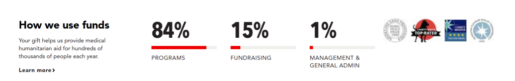 We rely on the generous support of more than seven million individual donors worldwide. Over 97 per cent of our funds comes from private donations, freeing us from any political affiliations and allowing us to act quickly to save lives.